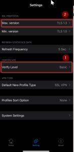 5. Then set the 1. Verify Level to Basic – 2. Max version to TLS 1.3