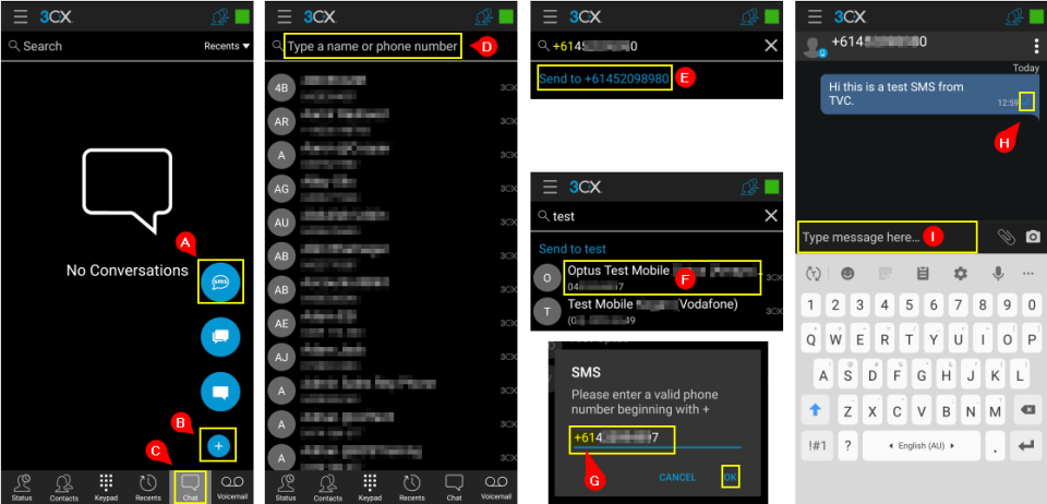 2. On the type a name or phone number D box enter a mobile number in E.164 format (e.g. +61412345678), then click the Send to E, or you can search contacts by name F. If the number saved on your contact is not in E.164 format, it will prompt you to correct the number format G.