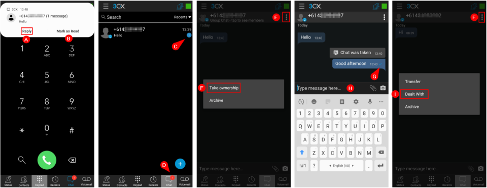 2. All call queue agents will receive the SMS notification. Unlike on one-on-one SMS, on a group SMS, you have to take ownership F of the SMS on the SMS conversation page, tap the More Options E icon, then select the Take Ownership F option. Replying to an SMS without taking ownership will automatically take ownership of the SMS.
