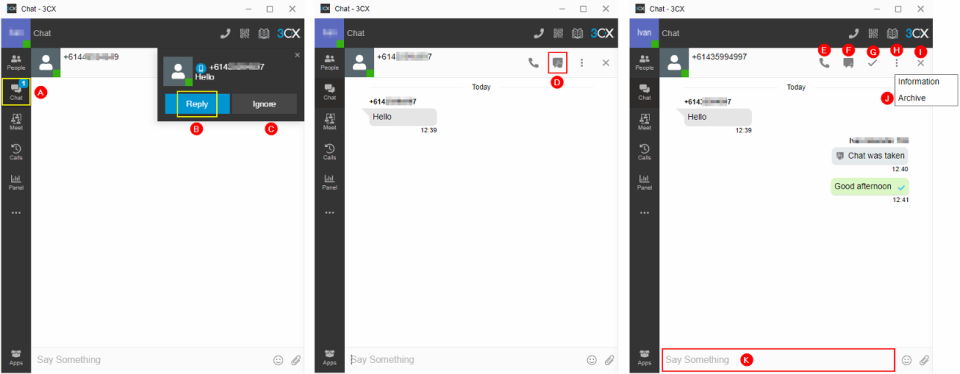 1. When receiving a new SMS, a numeric badge D appeared on the Chat icon and next to the new message C. If you’re outside the Chat page, you will receive a pop-up B notification.