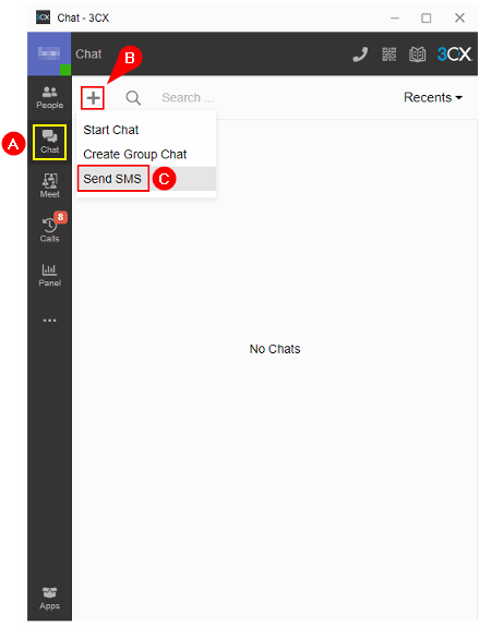 1. From your 3CX WebClient, go to the Chat A page, then click the Plus (+) B icon and select the Send SMS C option
