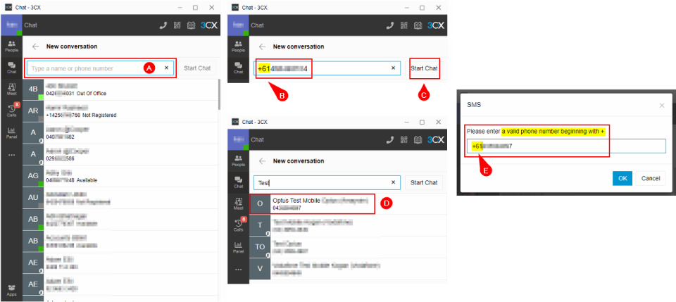 2. On the New Conversation page, type in a name or a phone number A. The mobile number must be in E.164 format B (e.g. +61412345678). If the number saved in the contact or the one you manually enter is not in the E.164 format, you have an opportunity to correct itE. Once you have entered a correct number or selected one from your contact D, click the Start Chat C button.