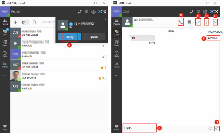 1. A new SMS is received as a pop-up on the 3CX WebClient, and you have two options: Ignore (find the SMS on the Chat page) or Reply A. When you click the Reply A button, you can enter your reply on the Say Something G box, click the Enter key, or click the Send H icon. On the SMS conversation window, you have options to: