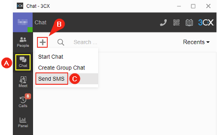 1. From your 3CX WebClient, go to the Chat A page, then click the Plus (+) B icon and select the Send SMS C option.